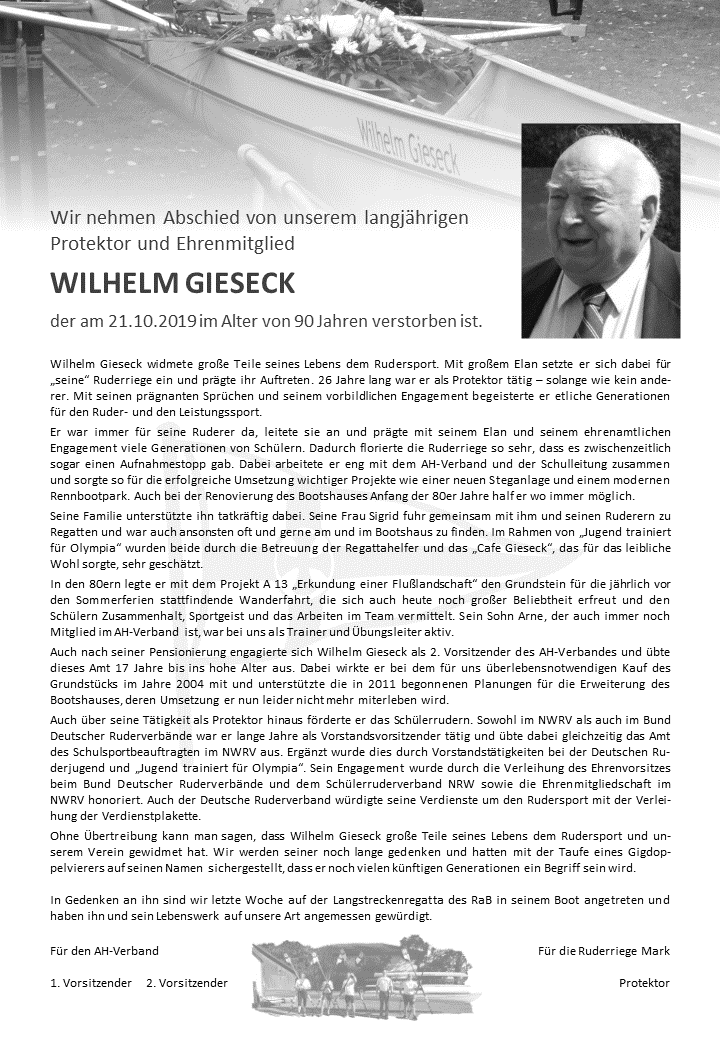 Wilhelm Gieseck widmete große Teile seines Lebens dem Rudersport. Auf Verbandsebene war er unter anderem lange Jahre Vorsitzender des Schülerruderverbandes NRW und Vorsitzender des Bundes