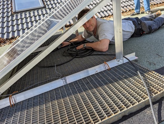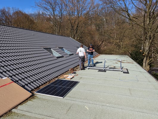 Da solche Anlagen in den letzten Wochen nach viel zu hohen Preisen im letzten Jahr wieder erstaunlich günstig geworden sind (ca. 700 Euro, inkl. Material drumherum), haben nun auch wir die Chance genutzt und eine solche Anlage auf Halle 2 montiert. Dank der fleißigen Hände von Ralf Pappe und Alexander Aufleger war das auch noch total flott erledigt, so dass wir den Stecker dann endlich heute Mittag in die passende Dose stecken konnten.