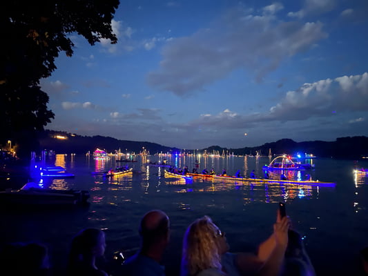 Und so fieberten alle auf das letzte Highlight des Tages hin: Die Lichterparade und das Höhenfeuerwerk! Natürlich haben auch wir uns mit gemütlich beleuchteten Booten beteiligt und unter die zahlreichen Segler, Kanuten und Ruderer gemischt. Und als dann der Himmel in tausend Farben leuchtete und im Takt dazu die Musik über die Promenade schallte, war klar, dass dieser Tag sehr lange in Erinnerung bleiben wird!