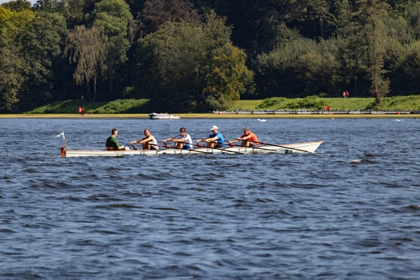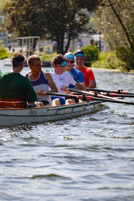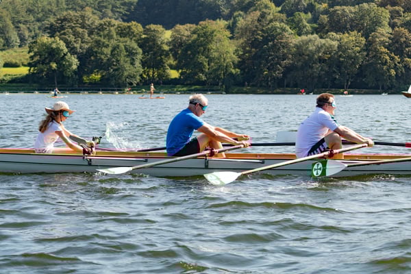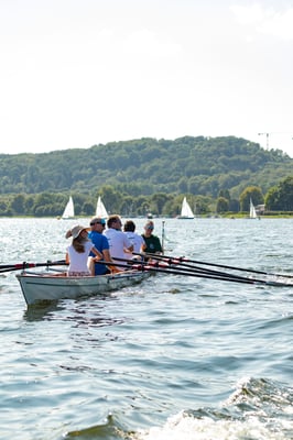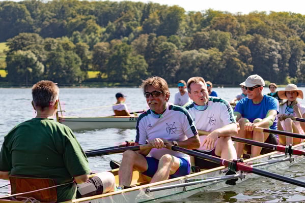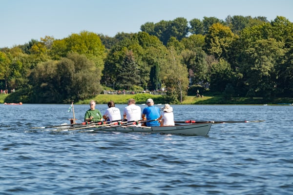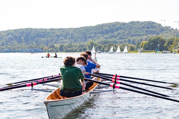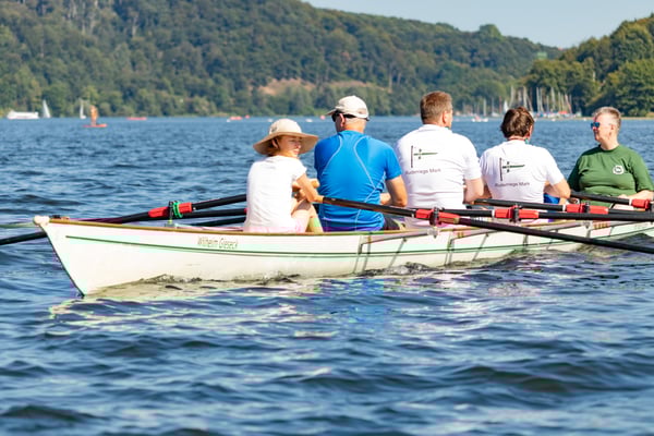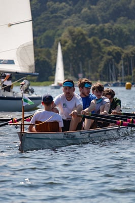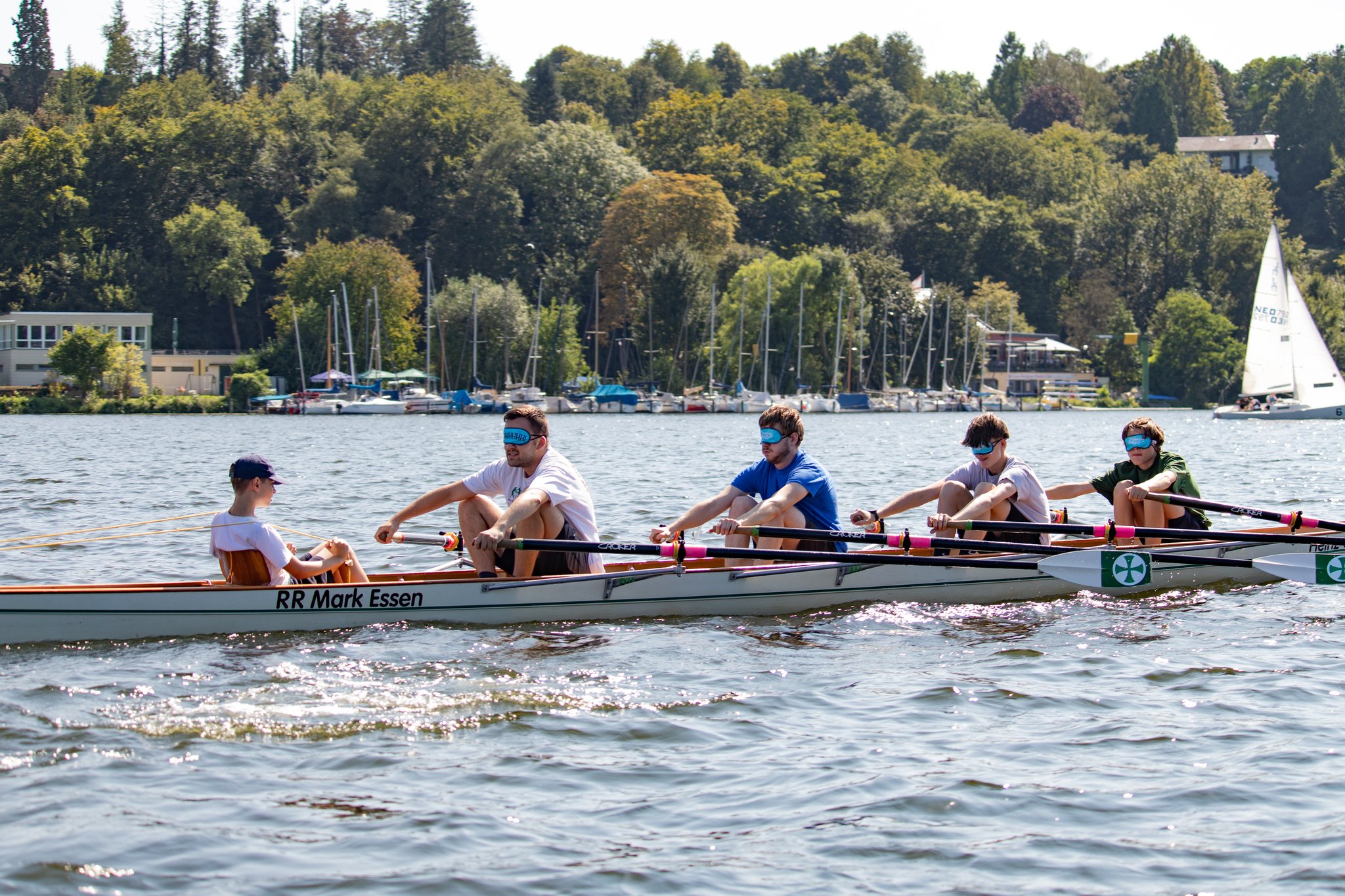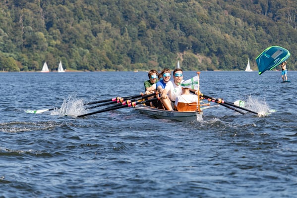 Ein Highlight an diesem Tag war das kleine Wettrudern zwischen Schülern und Ehemaligen im Doppel-Gigvierer. Die Herausforderung bestand darin, dass mit verbundenen Augen gerudert wurde – nur der Steuermann hatte freie Sicht. Die hochmotivierten Jugendlichen ließen sich davon jedoch nur wenig beeindrucken und gewannen beide Rennen mit klarem Vorsprung vor den nicht weniger motivierten Ehemaligen, die mit der ungewohnten Situation aber ein bisschen mehr Mühe hatten. Der Spaß, den trotzdem alle dabei hatten, war nicht zu übersehen.