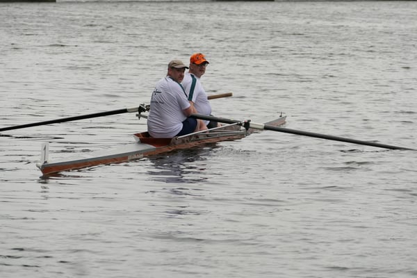 Jetzt wurde es brenzlig. Florian und Aurel mussten nach ihrem Sieg zügig das Boot wechseln. Mit unter 30 Minuten Abstand stand das Rennen zur "kleinen Vereinsmeisterschaft" im Gig-Doppelzweier mit Steuermann an. Also Boot raus, Boot rein. Eine super Hilfe waren hierbei unsere Fans aus der Ruderriege, die den Abtransport von Ralf übernahmen. Mit knappem Vorsprung konnten Aurel und Florian, gemeinsam mit Steuermann Simon Pelzer das Rennen gegen Alexander und Andrej mit Steuermann Lukas Aufleger für sich entscheiden. Angetreten ist die Siegermannschaft übrigens in unserem herausragenden "Klinkerzweier" Kirchesch.
