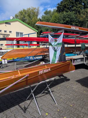 Ein besonderes Highlight war unser guter alter Renn-Zweier "Wilhelm", vermutlich Baujahr '50: Den jüngeren Teilnehmern war ein "bespanntes" Boot angesichts der tief hängenden Unterkiefer wohl unbekannt und die Älteren haben die "frisch zusammen gesetzte" Mannschaft mit der Frage gewürdigt, ob es sich um "unser Jugendboot" handeln würde 😂.